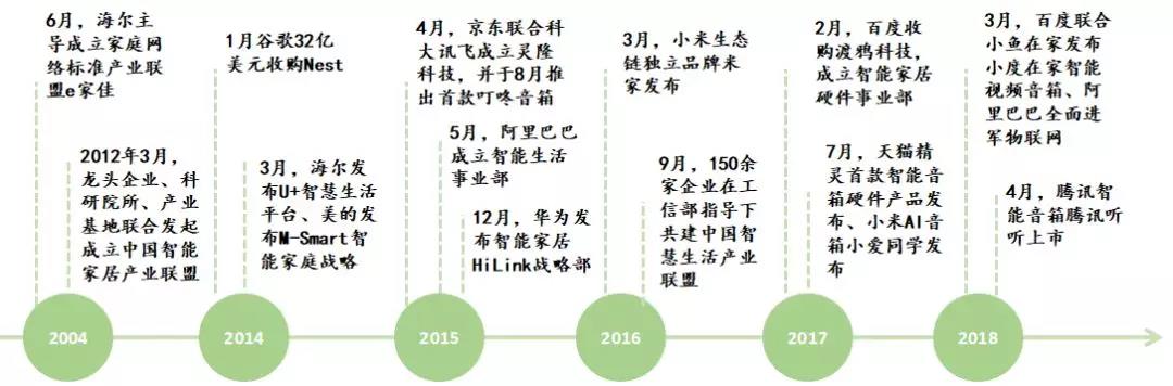 早期的中國智能家居市場受制于技術(shù)和市場環(huán)境,盡管有龍頭企業(yè)和科研院所等大力推動,但一直是不瘟不火。直到2014年谷歌以32億美元收購Nest的事件引爆全球的智能家居產(chǎn)業(yè),同年的美國CES上,三星和LG也推出了各自的智能家居平臺。在此背景下,智能家居的熱度席卷至國內(nèi)市場,除最早進入的一批家電企業(yè)外,消費電子、互聯(lián)網(wǎng)公司以及運營商等產(chǎn)業(yè)鏈中的關(guān)聯(lián)方也紛紛進場,或自研智能硬件,或布局生態(tài)平臺。不同類型企業(yè)間的跨界合作和開放生態(tài)成為智能家居市場的主流。亞馬遜Echo的成功讓國內(nèi)市場開始聚焦智能音箱這一入口級產(chǎn)品,2017年下半年開始的入口爭奪戰(zhàn)的背后,是巨頭公司對整個智能家居生態(tài)的野心。