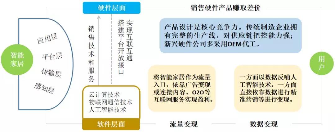 將智能家居劃分為硬件和軟件兩個層面,其中硬件對應于智能家居的應用層,軟件對于智能家居的平臺層、傳輸層和感知層。硬件產(chǎn)品的品牌方專注于產(chǎn)品側(cè)的設計和制造,向終端用戶提供的是智能家居的物理屬性,通過銷售硬件賺取差價實現(xiàn)盈利。針對智能家用產(chǎn)品的云計算、物聯(lián)網(wǎng)通信和人工智能三項核心技術(shù),技術(shù)供應商通常會提供其中的一項或多項能力。他們既可以選擇直接通過向硬件廠商銷售技術(shù)和服務變現(xiàn),也可以選擇以硬件產(chǎn)品連接到海量的終端用戶,利用獲取到的用戶流量和數(shù)據(jù),通過面向消費者的互聯(lián)網(wǎng)服務和面向企業(yè)的數(shù)據(jù)服務進行變現(xiàn)。